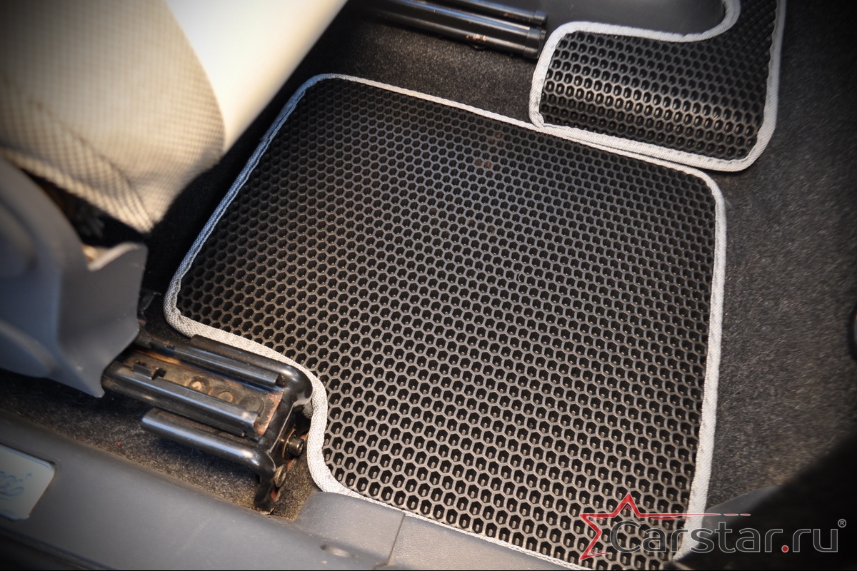 Толщина ковриков EVA составляет 10-12 мм. Глубина ячеек 7-8 мм. Такая толщина ковриков позволяет им служить довольно долго, не протираясь до 3 лет. А благодаря такой глубине ячеек коврик EVA площадью 1 кв.м. способен захватить около 3,5 л жидкости, сохраняя в чистоте вашу обувь и обивку салона.