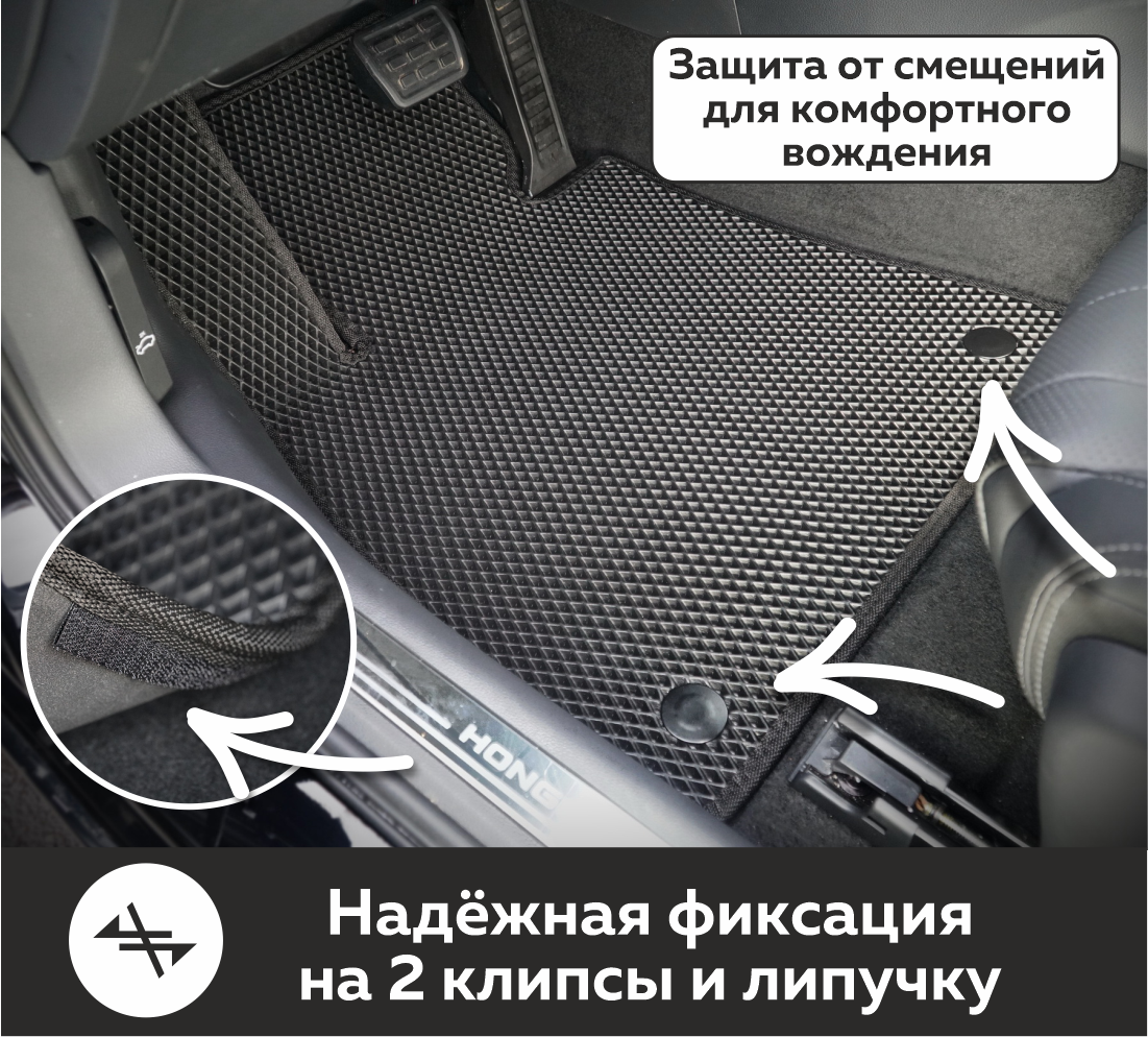 Коврики EVA надёжно крепятся с помощью оригинальных систем фиксации. Благодаря клипсам и липучке коврики защищены от смещений, что обеспечивает комфорт и безопасность вождения. Максимальное удобство также достигается точными, улучшенными лекалами для каждого автомобиля.