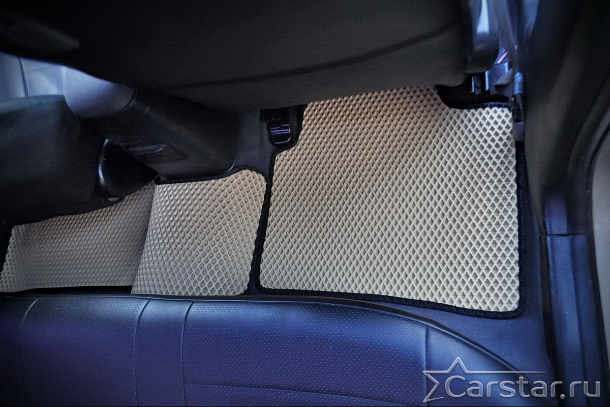 Толщина ковриков EVA составляет 10-12 мм. Глубина ячеек 7-8 мм. Такая толщина ковриков позволяет им служить довольно долго, не протираясь до 3 лет. А благодаря такой глубине ячеек коврик EVA площадью 1 кв.м. способен захватить около 3,5 л жидкости, сохраняя в чистоте вашу обувь и обивку салона.