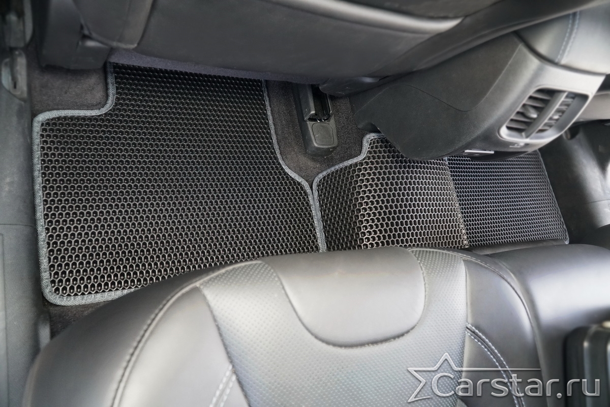 Толщина ковриков EVA составляет 10-12 мм. Глубина ячеек 7-8 мм. Такая толщина ковриков позволяет им служить довольно долго, не протираясь до 3 лет. А благодаря такой глубине ячеек коврик EVA площадью 1 кв.м. способен захватить около 3,5 л жидкости, сохраняя в чистоте вашу обувь и обивку салона.