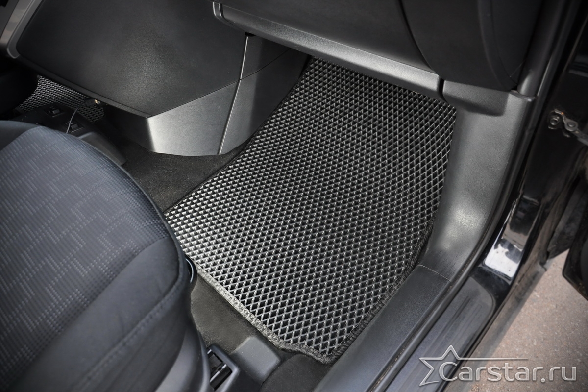 Толщина ковриков EVA составляет 10-12 мм. Глубина ячеек 7-8 мм. Такая толщина ковриков позволяет им служить довольно долго, не протираясь до 3 лет. А благодаря такой глубине ячеек коврик EVA площадью 1 кв.м. способен захватить около 3,5 л жидкости, сохраняя в чистоте вашу обувь и обивку салона.