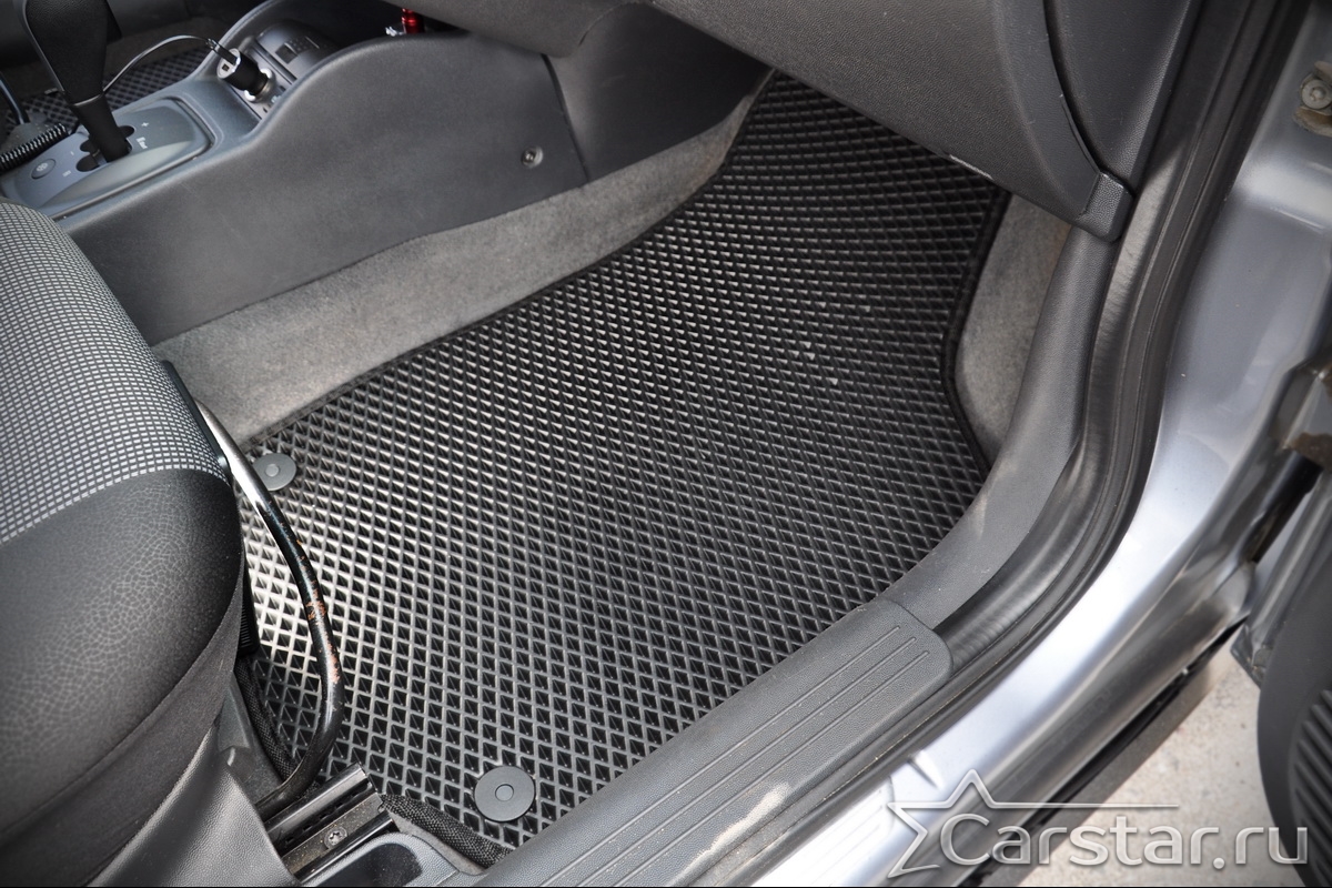 Толщина ковриков EVA составляет 10-12 мм. Глубина ячеек 7-8 мм. Такая толщина ковриков позволяет им служить довольно долго, не протираясь до 3 лет. А благодаря такой глубине ячеек коврик EVA площадью 1 кв.м. способен захватить около 3,5 л жидкости, сохраняя в чистоте вашу обувь и обивку салона.