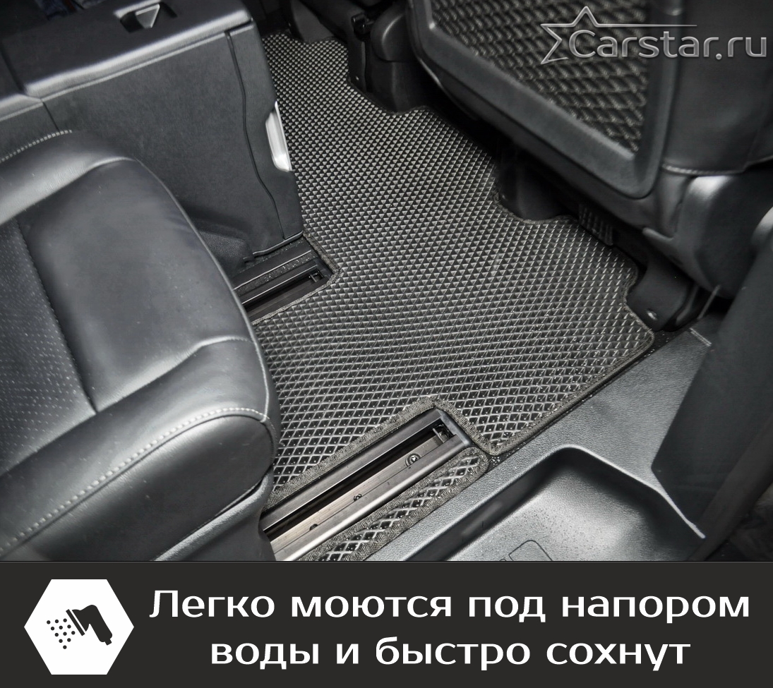 Текстильные коврики надёжно крепятся с помощью оригинальных систем фиксации. Обратная сторона имеет противоскользящее покрытие, что обеспечивает защиту от смещений и безопасность. Максимальное удобство достигается точными лекалами.
